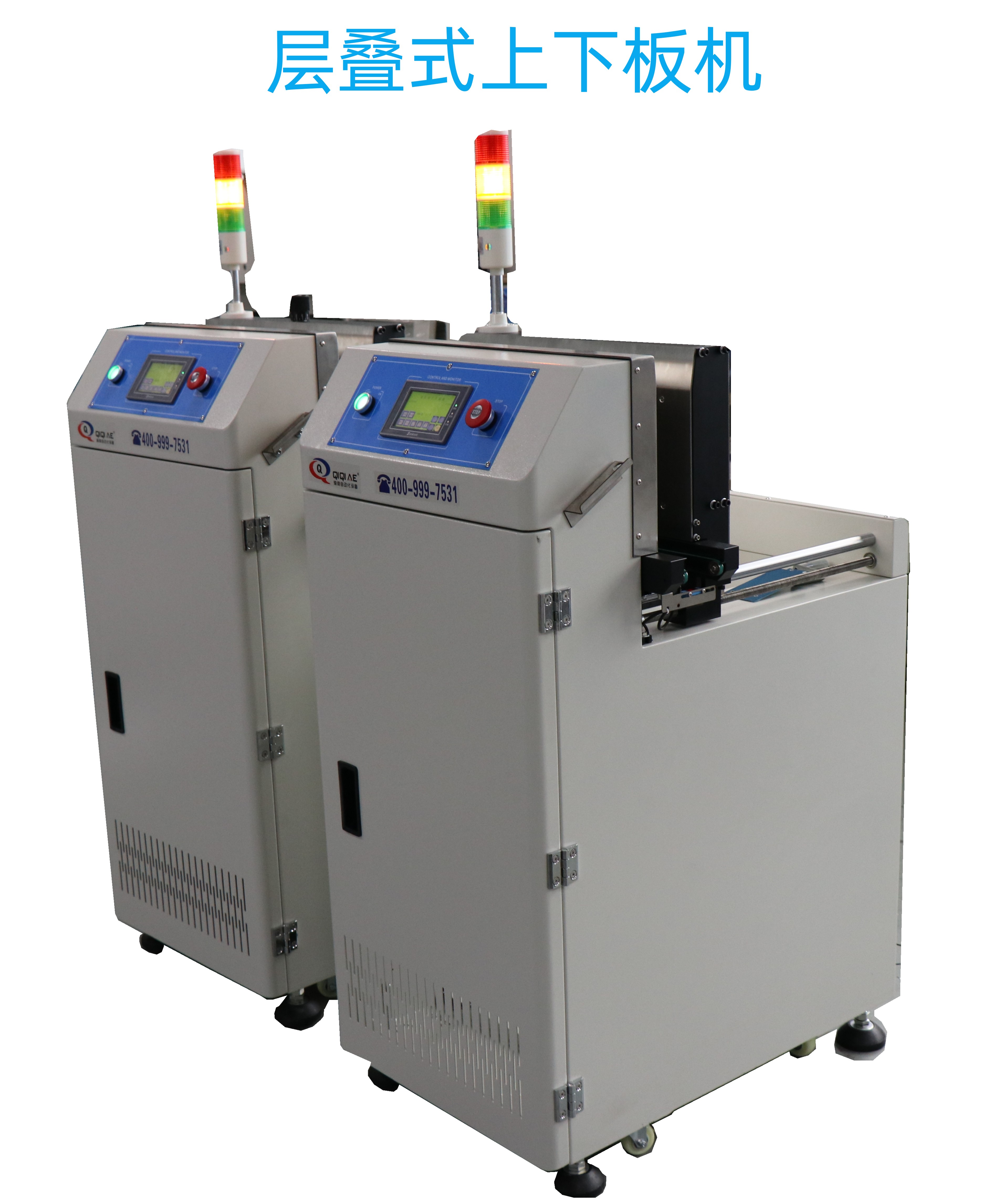 功能描述:此設備用在SMT生產線前端,將做好的PCB板收納好。當接收到上位機選用亞德客標準氣缸推板,出板信號后,將光面PCB板收納在疊板位。